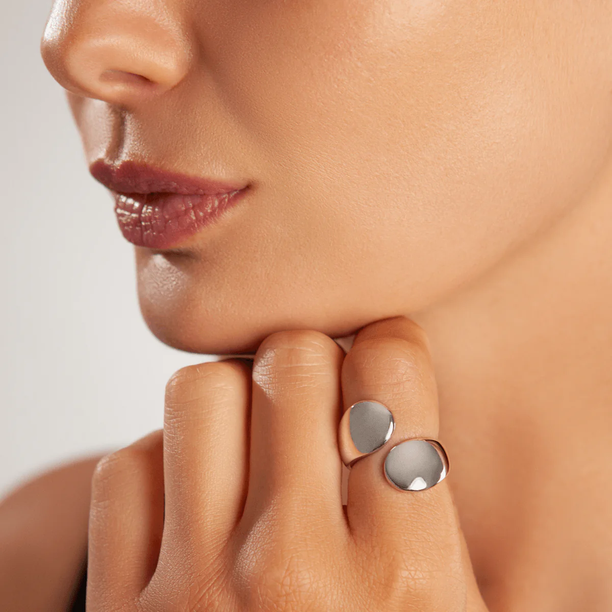 Abstract jewellery for the up-to-date fashionista! This polished band ring is both contemporary and ageless. A statement ring that complements any aesthetic, it’s perfect for mix-and-match or as a standalone piece. Whether you’re going out clubbing or heading to an important meeting, it’s ideal style for every occasion.